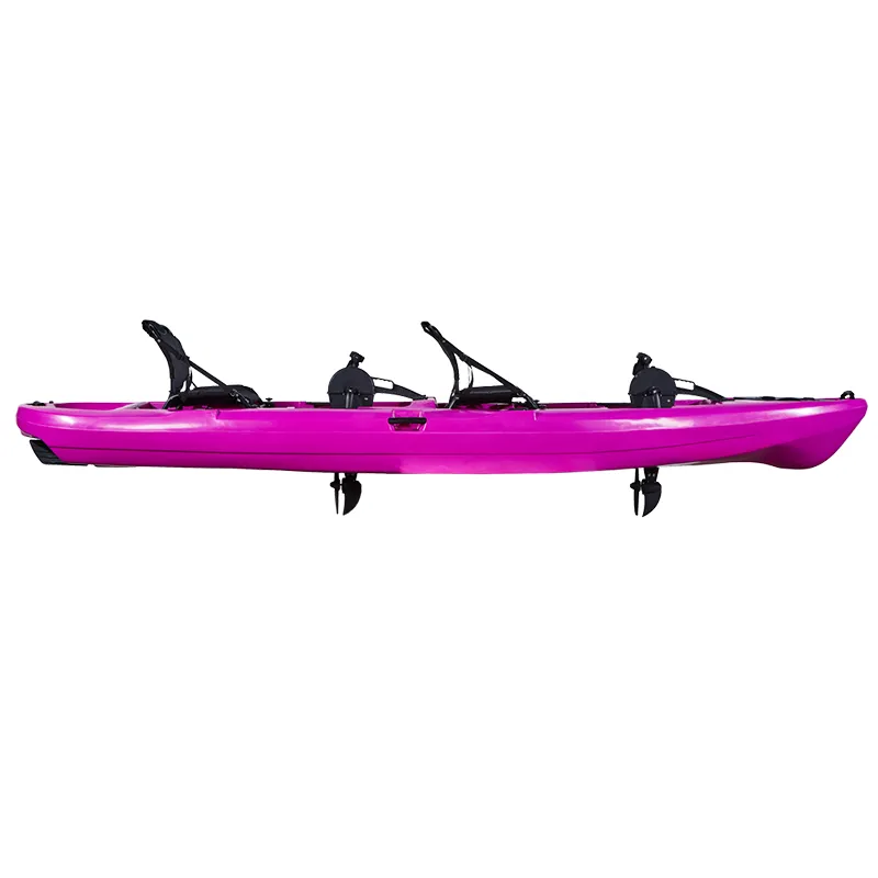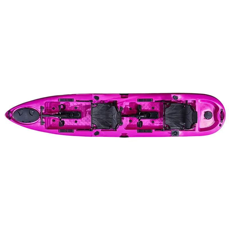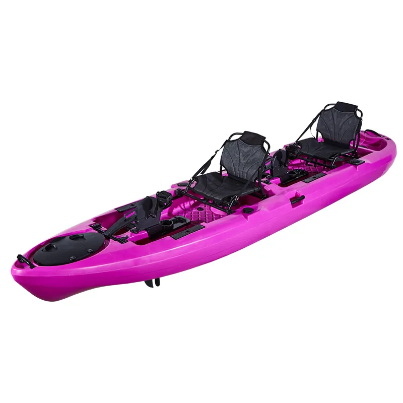 Kayak de pêche tandem à propulsion pédales, conçu pour deux pêcheurs. Stable, espacieux et facile à manœuvrer à deux.